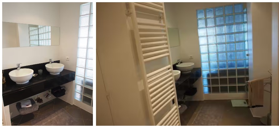 Comfortable living space: The bedroom is furnished with a large double bed and offers plenty of storage. The living room includes two large sofa beds. The bathroom is very spacious and includes a shower, toilet, two sinks, and several storage areas.