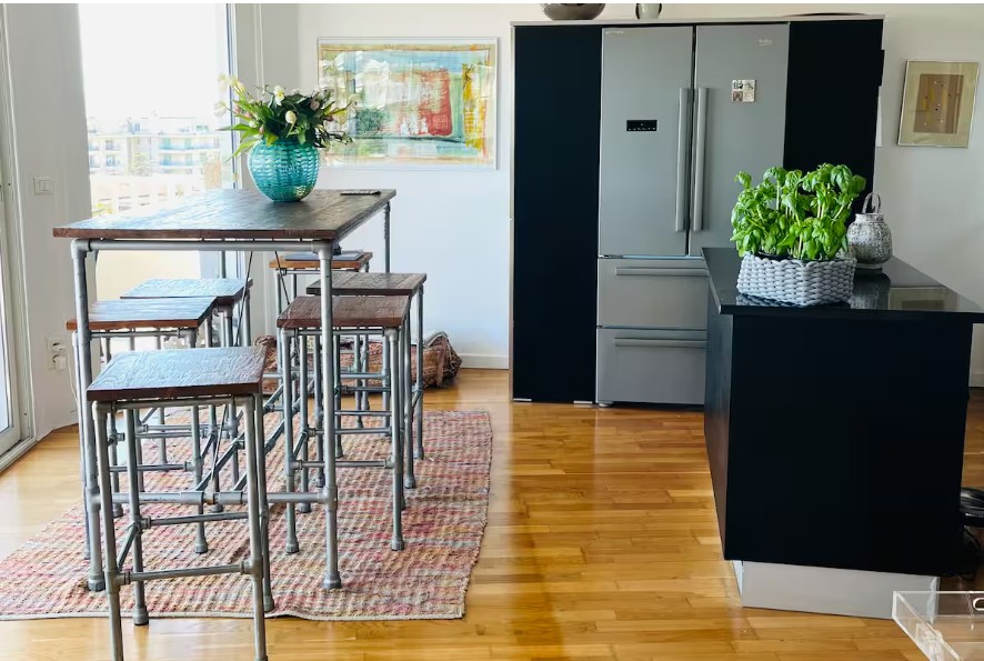 A large wooden high table with six stools allows you to enjoy meals while taking in the breathtaking view of the Lérins Islands!