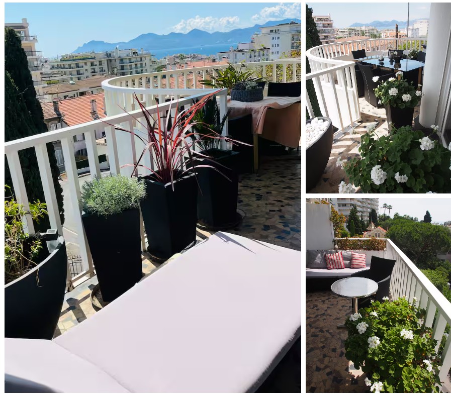 Comfortable Living Space: Large studio with terrace and exceptional panoramic sea view in Cannes. Also, a bathroom with a shower and a tub.