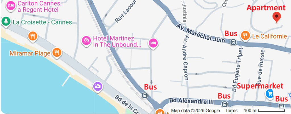 Ideally located: Just steps from the city center bus stop (line 21) and approximately 2 km from the central train station, the main bus station, and the Palais des Congrès. Several supermarkets are within easy walking distance. Nice Airport is 24 km away by bus, train, or taxi.
